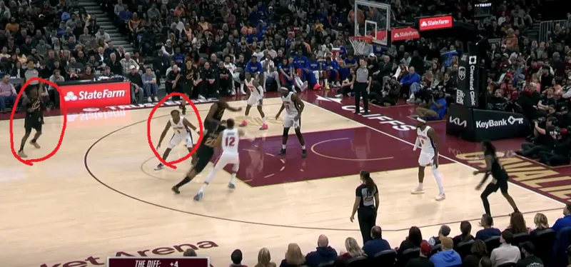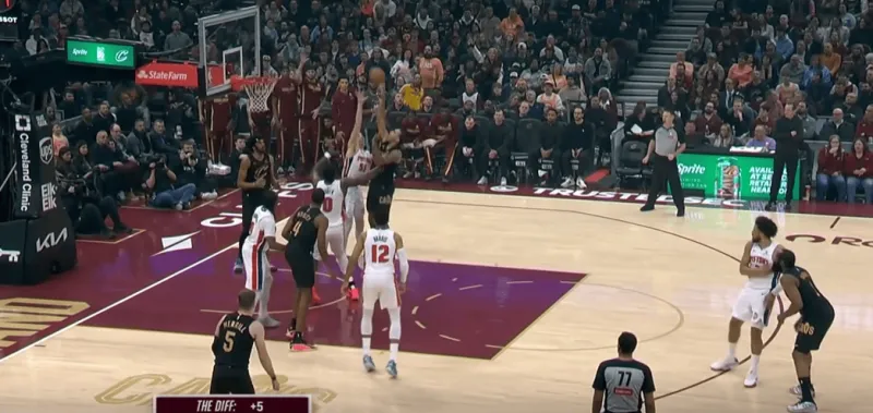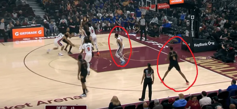 当对位中锋时,泰森主导拉开单侧的二人转掩护发起,埃利斯的突破吸引斯图尔特回收,这给了泰森外弹利用脚步优势惩罚对手的机会。